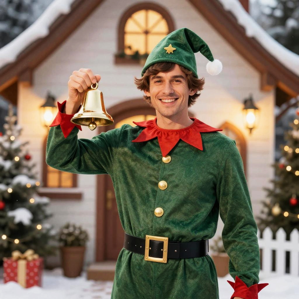 Man in Holiday Elf Costume Holding Bell in Front of Festive Winter House