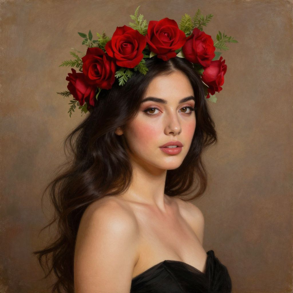 A young woman with long dark hair wears a striking crown made of vibrant red roses and greenery, set against a softly textured, neutral background. Her serene expression and subtle makeup highlight her natural beauty, creating an elegant and timeless portrait reminiscent of classical painting styles.