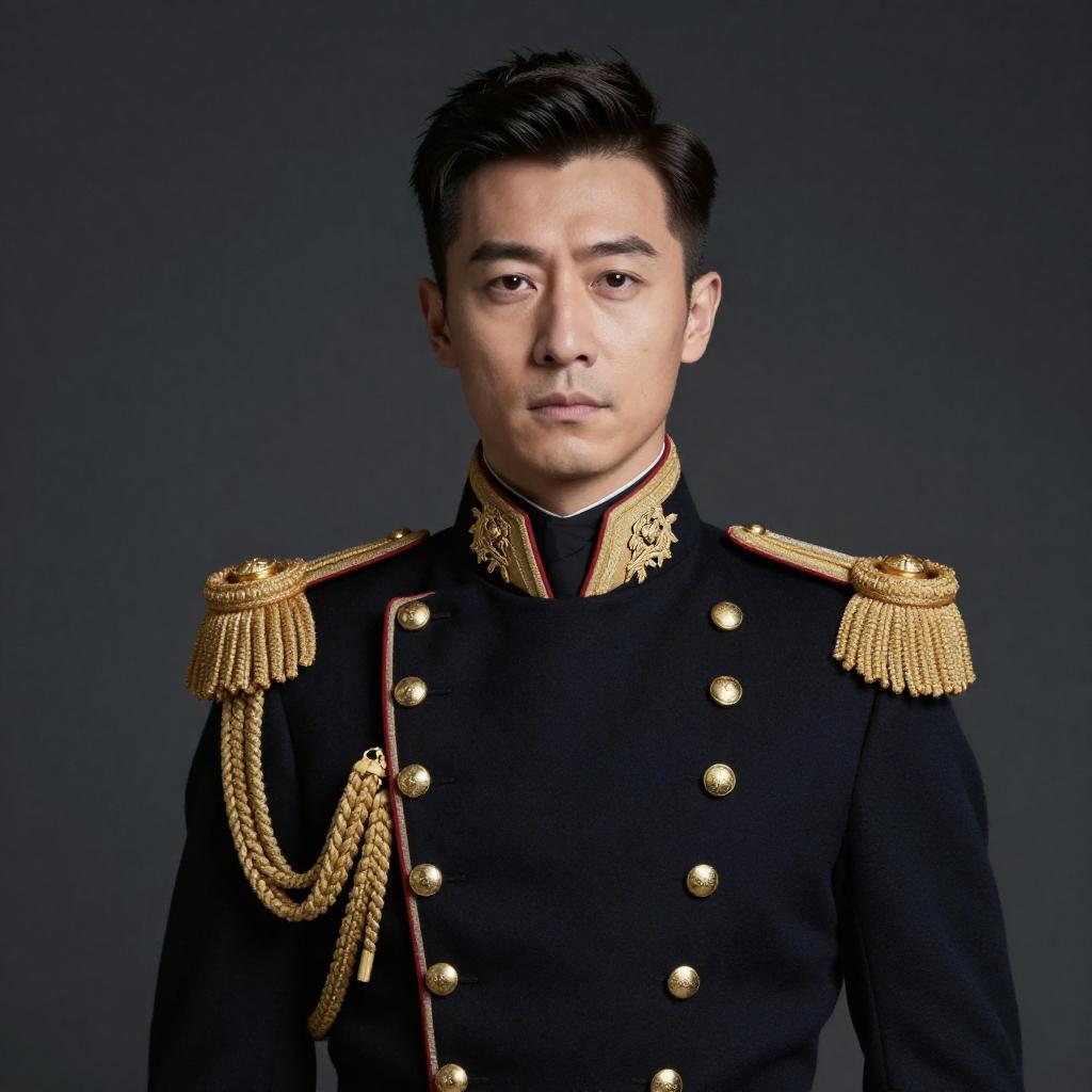 A stern-looking young man in a formal military uniform featuring gold decorative buttons, epaulettes, and braided cords. The dark navy jacket with intricate gold embroidery evokes a classic ceremonial style with a modern portrait photography aesthetic.