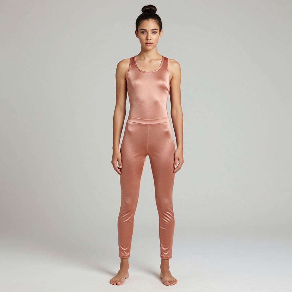 A woman stands barefoot against a plain background, wearing a shiny, rose gold metallic sleeveless jumpsuit. The form-fitting outfit highlights a sleek and modern style, emphasizing simplicity and elegance in a studio setting.