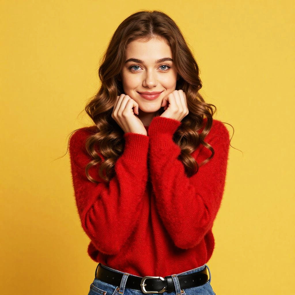 A cheerful young woman with long, wavy brown hair poses against a vibrant yellow background. She is wearing a cozy red sweater and blue jeans, smiling warmly while holding her hands near her face, creating a friendly and inviting atmosphere.