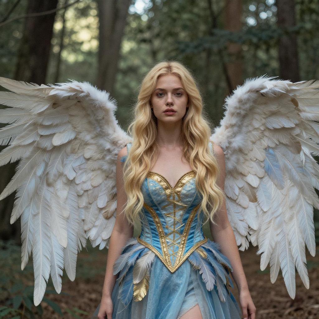 A woman with long blonde hair stands in a forest wearing a detailed blue corset dress adorned with gold and feather embellishments. She has large, white angel wings extending from her back, creating a mystical and ethereal atmosphere in the natural setting.