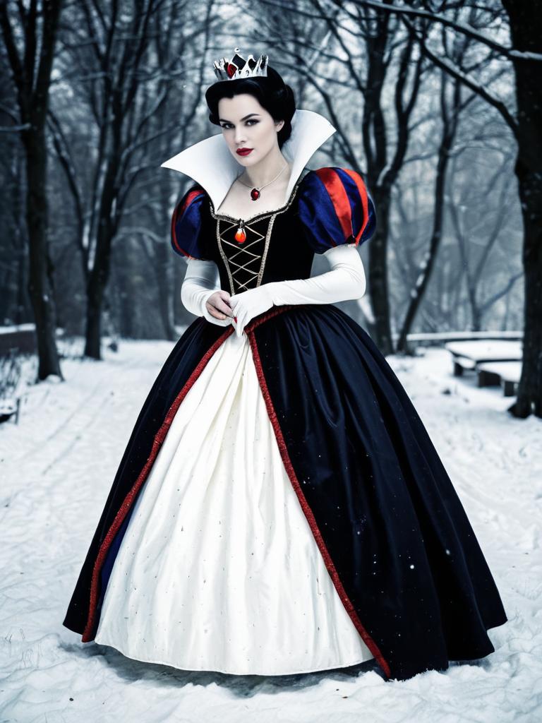 A woman dressed in a striking Snow White evil queen costume stands in a snowy forest setting. The elaborate dress features a high white collar, puffed sleeves with red and blue stripes, and a full skirt with contrasting black and white panels, complemented by a crown and red gemstone necklace. This dramatic costume blends classic fairytale style with a dark, regal twist.