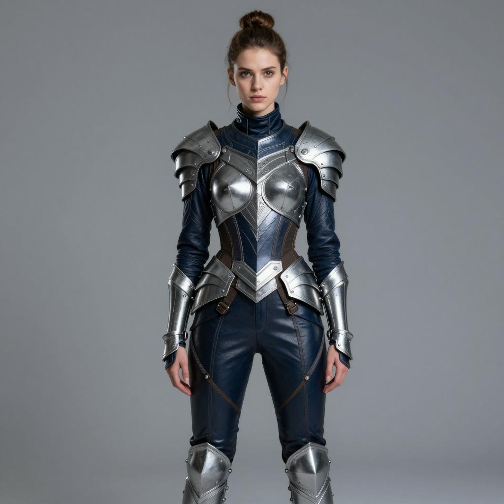 A confident woman stands wearing a futuristic suit of armor combining sleek navy blue fabric with polished silver metal plates. Her outfit features layered shoulder guards, gauntlets, and thigh armor, blending medieval influences with a modern, sci-fi aesthetic against a neutral gray background.