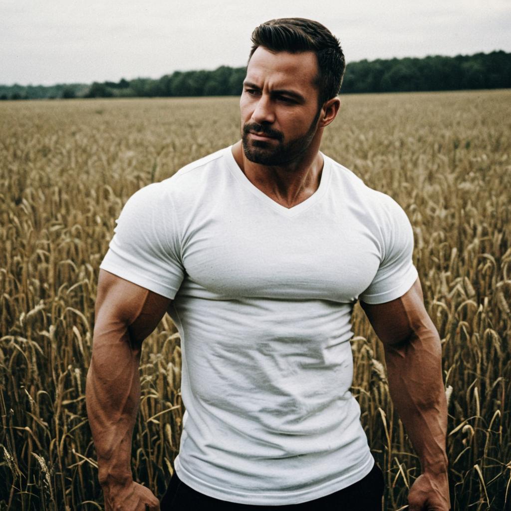 A muscular man stands confidently in a field of tall wheat, wearing a fitted white V-neck shirt that highlights his bodybuilder physique. The natural outdoor setting contrasts with his strong, athletic appearance, showcasing a blend of fitness and nature.