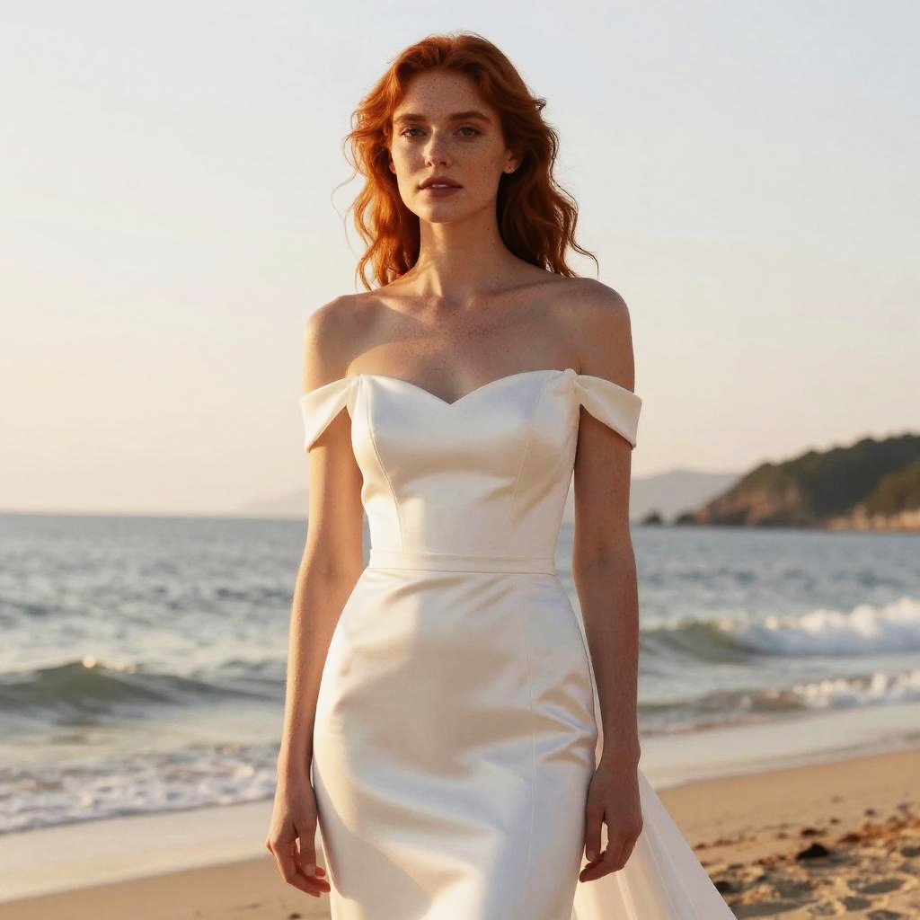 A young woman with red hair wearing an elegant off-the-shoulder white satin dress stands on a beach during sunset. The soft natural lighting and serene ocean backdrop highlight the timeless and minimalist bridal style she embodies.