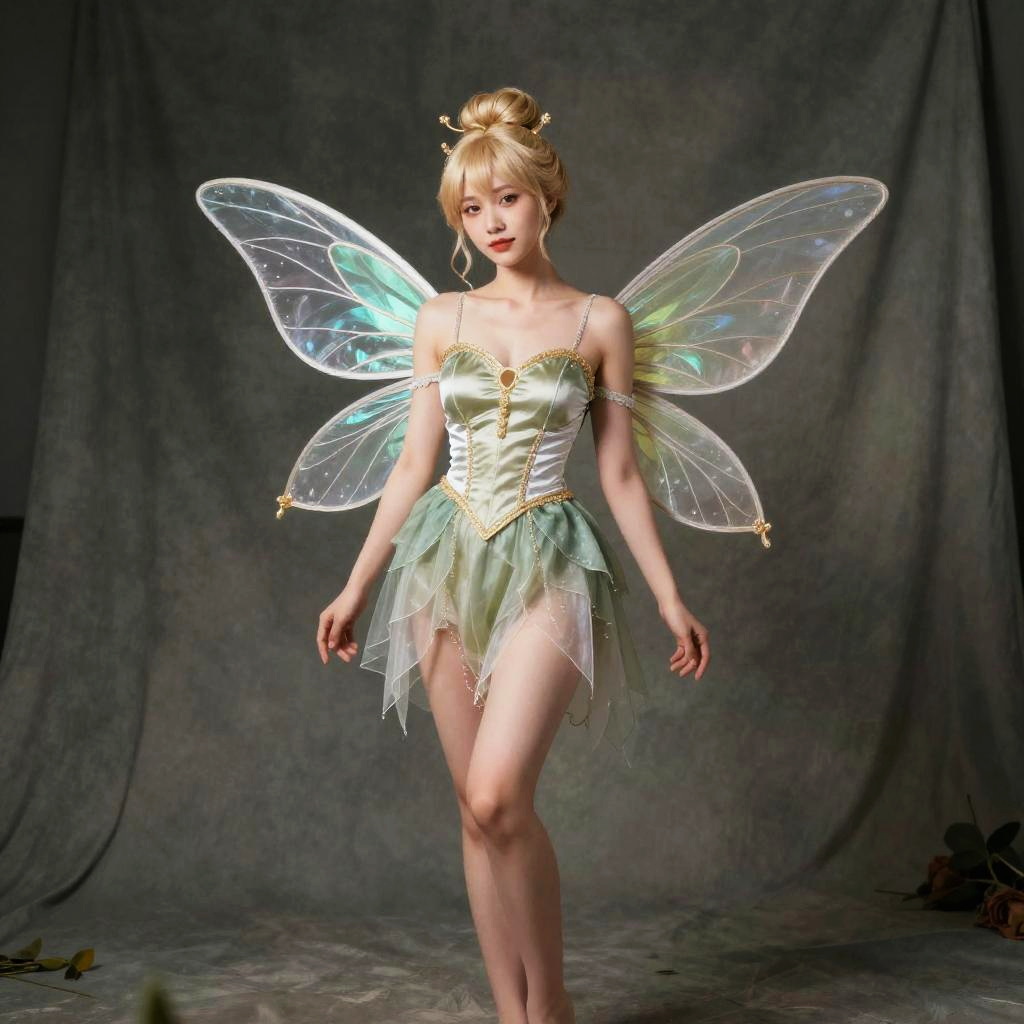 A woman stands gracefully in a detailed fairy costume featuring iridescent wings and a green, layered dress with gold accents. The soft lighting highlights the delicate textures and whimsical style, set against a neutral backdrop.