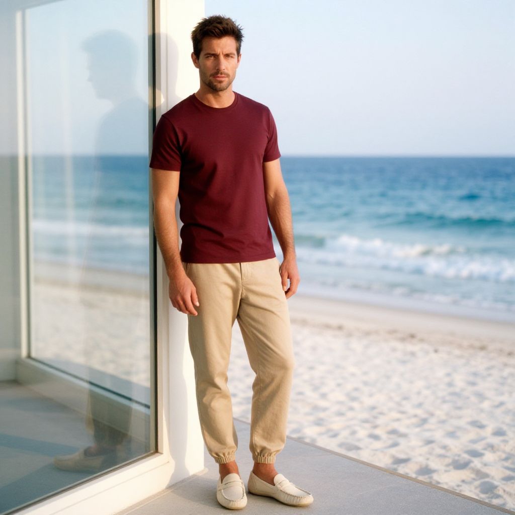 A casually dressed man stands beside a glass window with the ocean and sandy beach in the background. Wearing a maroon t-shirt and beige jogger pants paired with white loafers, he exudes a relaxed and stylish vibe perfect for a coastal setting.