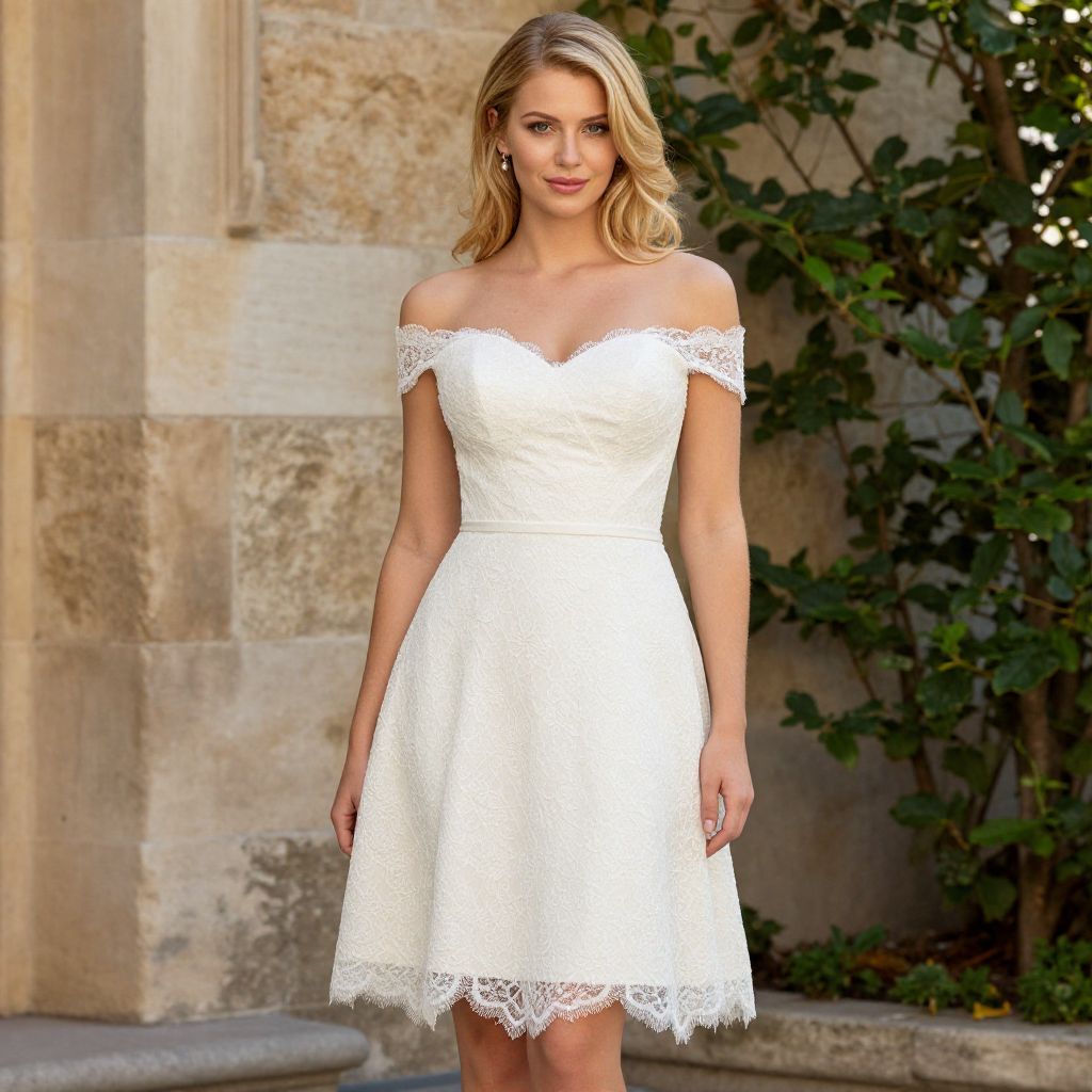 A beautiful woman models an elegant off-the-shoulder white lace dress with a fitted bodice and flared skirt, standing against a rustic stone wall backdrop with greenery. The dress features delicate scalloped lace edges on the sleeves and hem, creating a romantic and timeless look.