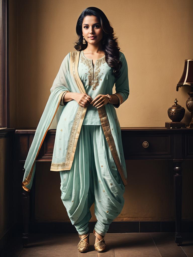 A woman is elegantly dressed in a traditional dhoti suit salwar featuring a pastel sea-green color with intricate golden embroidery and border detailing, exuding cinematic realism. She stands confidently indoors against a warm, classic backdrop that complements her attire, showcasing the grace and cultural richness of this traditional outfit.