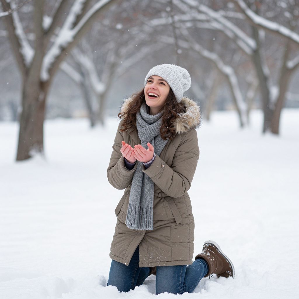 A woman dressed warmly in a winter coat with a fur-lined hood, a knitted beanie, and a scarf kneels joyfully in the snow-covered ground. Surrounded by leafless trees on a snowy day, she looks upward smiling as snowflakes fall around her in this serene winter scene.