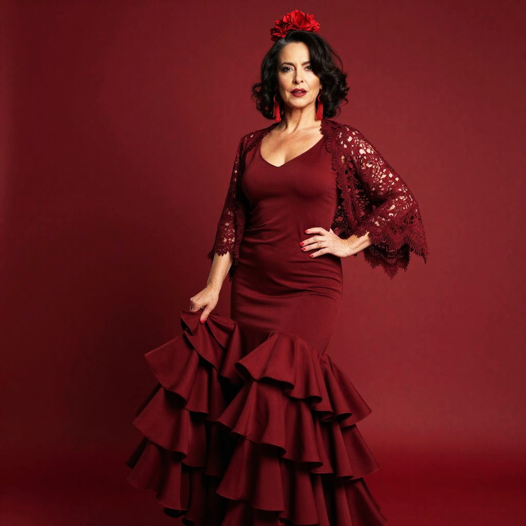 A confident woman dressed in a deep red flamenco-style dress poses gracefully against a matching red background. She wears a lace shawl and red accessories, including tassel earrings and a flower in her hair, embodying traditional Spanish elegance.