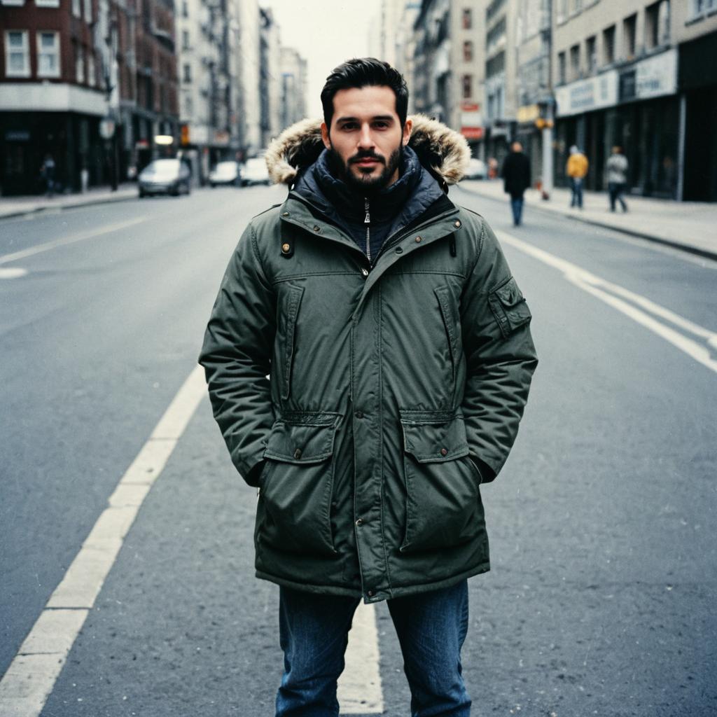 A man stands confidently on a city street, wearing a stylish green parka coat with a fur-lined hood paired with jeans. The urban background features blurred pedestrians and buildings, emphasizing the casual yet warm winter fashion choice.