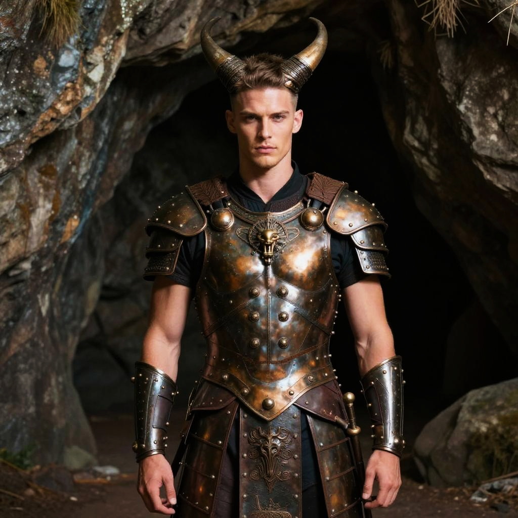 A young man stands boldly in front of a rocky cave entrance wearing intricately detailed bronze armor with a lion emblem on the chest and large curved horns on his head, evoking a fantasy or mythological warrior persona. The dramatic lighting highlights the armor's texture and the serious expression of the man, blending medieval and fantasy elements in a striking, heroic composition.