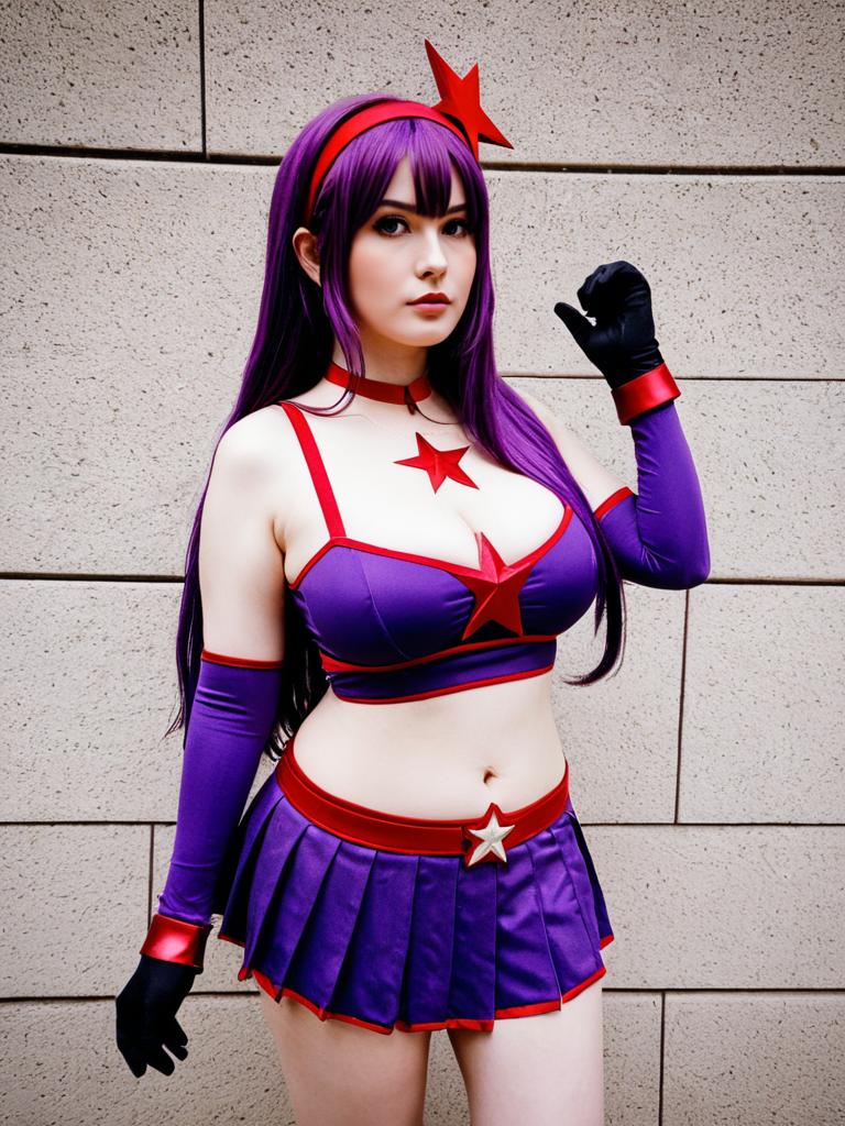 A woman is dressed in a vibrant purple and red cosplay outfit inspired by the character Athena from the Asamiya series, featuring star motifs and a pleated skirt. Her long purple hair, matching arm sleeves, and confident pose highlight the detailed and dynamic anime style of the costume.