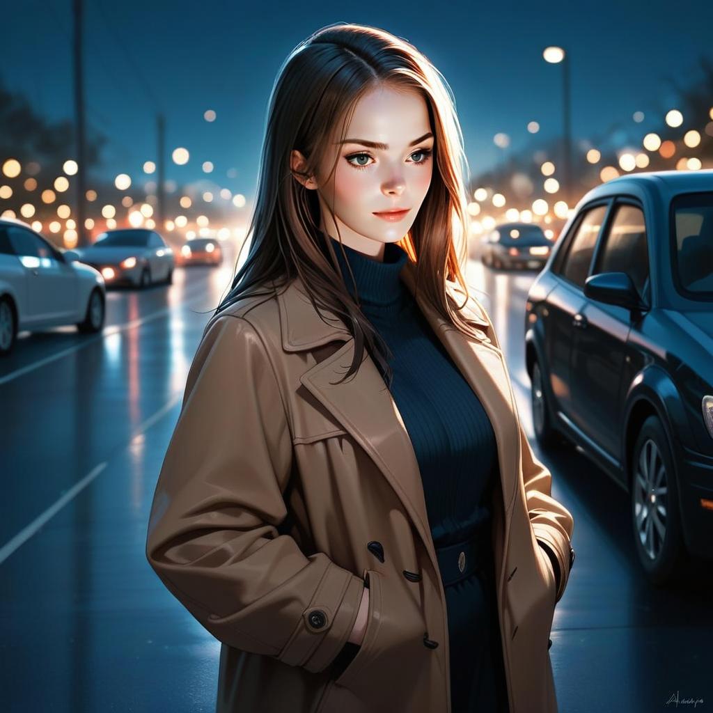 A stylish young woman stands confidently on a bustling city street at night, illuminated by soft glowing streetlights and the headlights of passing cars. The digital illustration captures a modern and elegant vibe with a vivid, highly detailed style emphasizing the subject’s calm and contemplative expression.