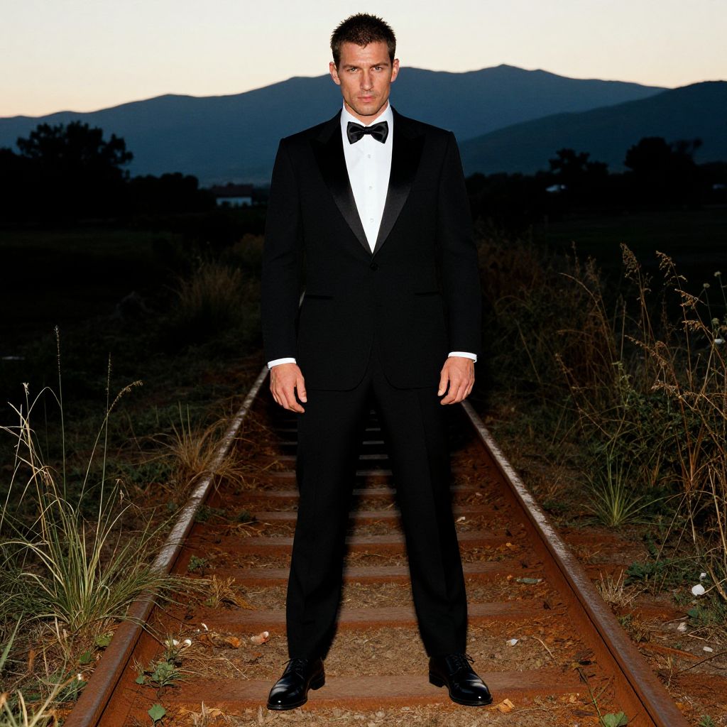 A sharp-dressed man stands confidently on a set of railway tracks during twilight, wearing a classic black tuxedo with a bow tie. The serene landscape of mountains and foliage in the background contrasts with his formal attire, creating a striking and dramatic composition.