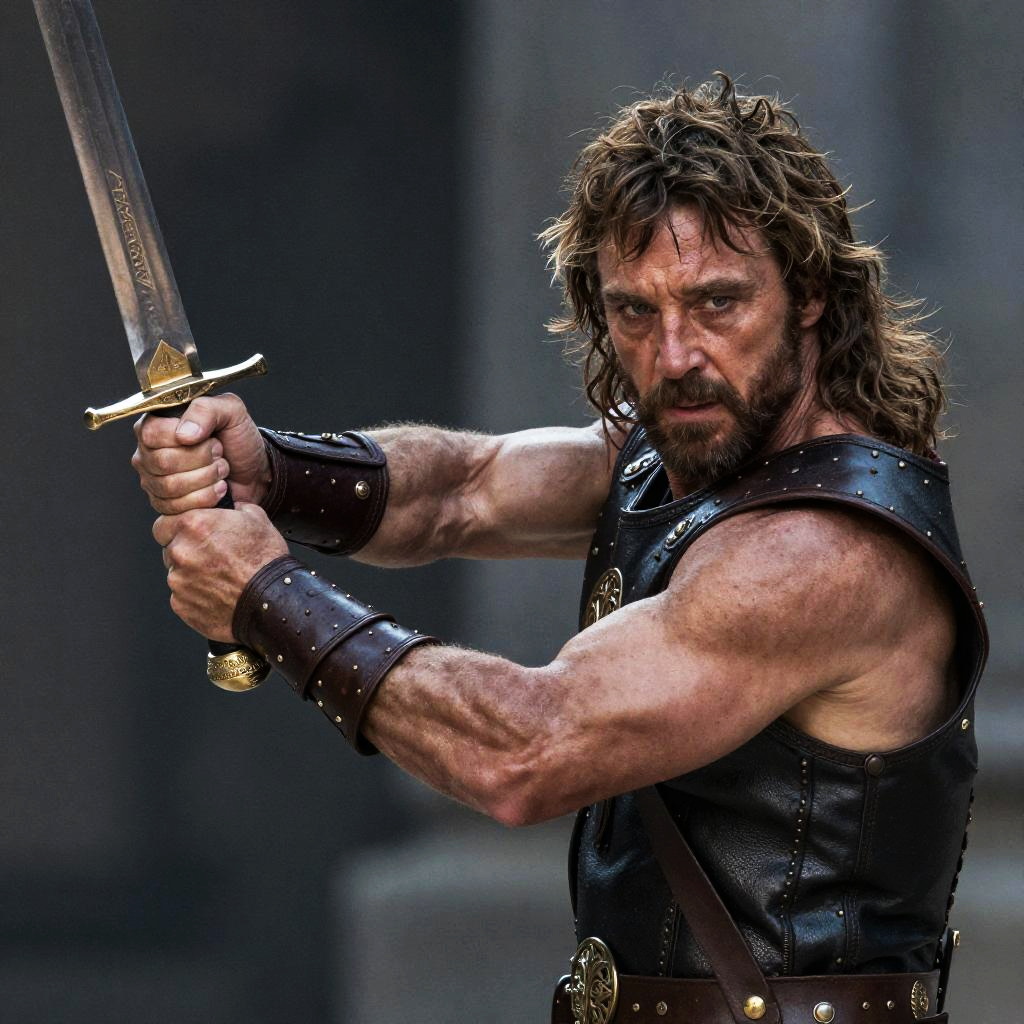 A muscular man in ancient warrior armor brandishes a sword with intense focus, embodying the fierce spirit of a historical or fantasy battle scene. His rugged appearance, detailed with leather arm guards and a studded leather vest, highlights a dramatic and action-packed medieval style.