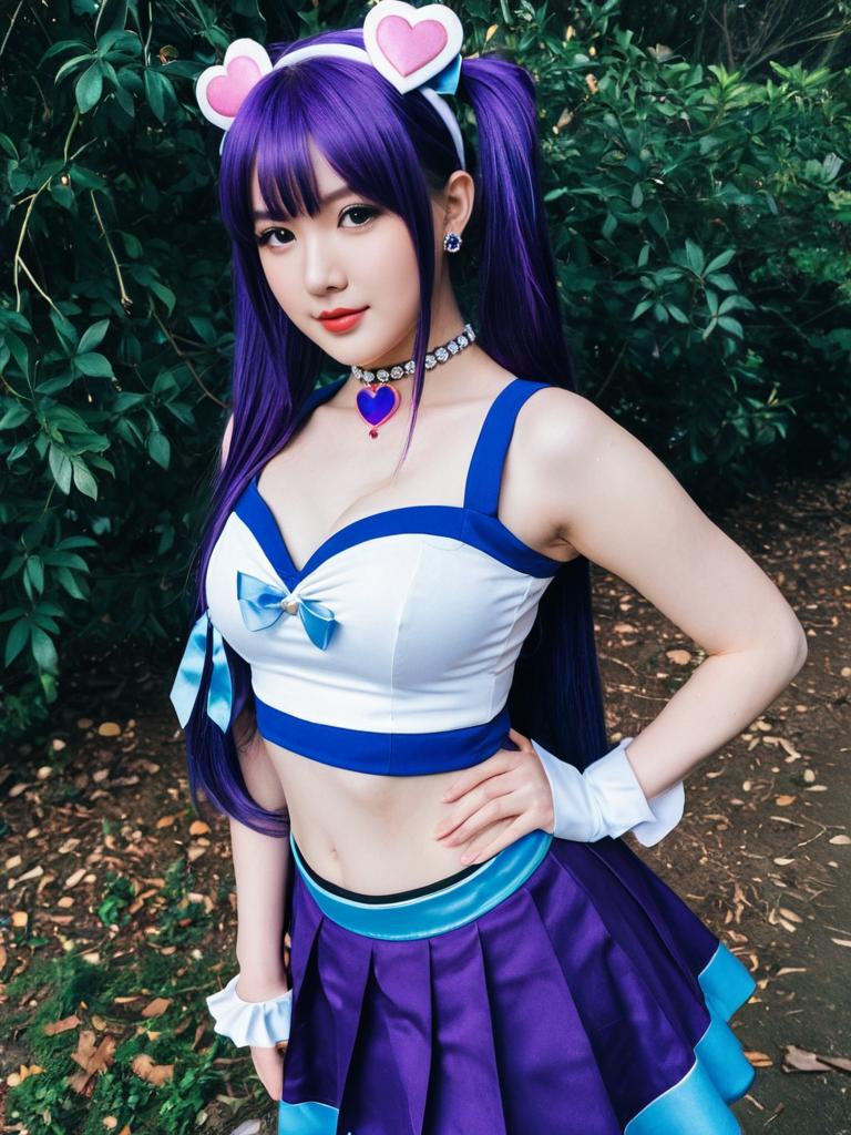 A woman dressed as Aono Miki from an anime or manga series, featuring vibrant purple twin-tail hair and a stylish blue and white sailor-inspired outfit. The cosplay highlights detailed accessories including heart-shaped hair clips, a sparkling choker with a heart pendant, and a pleated skirt, set against a natural outdoor background.