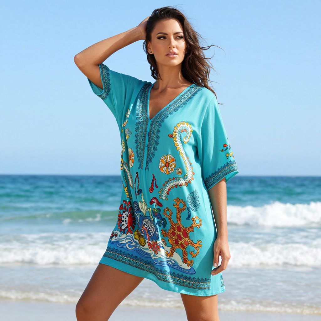 A woman stands confidently on a sunny beach wearing a vibrant turquoise kaftan adorned with intricate, colorful sea-inspired patterns. The loose, comfortable fit and playful design make the outfit perfect for a relaxed seaside day. The bright blue ocean and clear sky provide a stunning backdrop, enhancing the summery, carefree vibe of the scene.