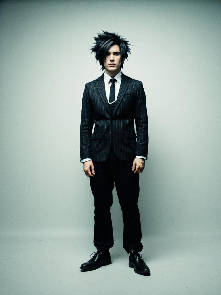 A man in a full body cosplay photo stands confidently wearing a black pinstripe suit, white shirt, and black tie, styled with an edgy Edgar-cut hairstyle. The photorealistic image captures the sharp contrast between the formal attire and the modern, spiked hair, emphasizing the unique blend of classic and contemporary cosplay fashion.