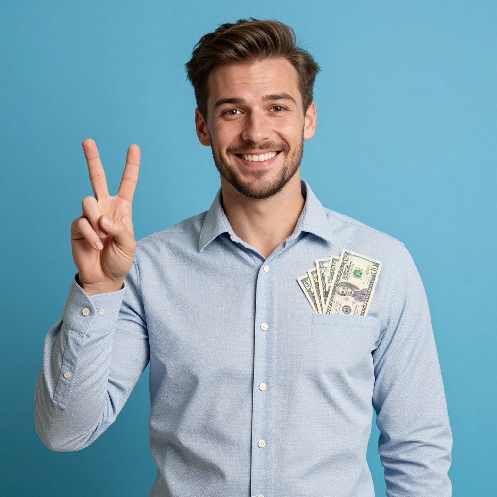 A smiling man wearing a light blue shirt with several US dollar bills visible in his chest pocket gestures a peace sign with his fingers against a solid blue background. The image conveys a positive and confident attitude, suggesting success or financial achievement.