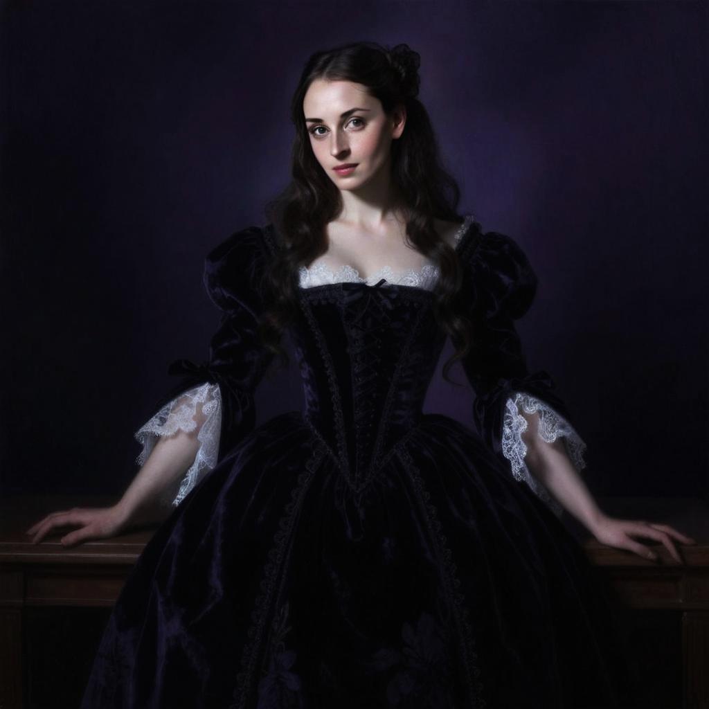 A young woman dressed in an elegant, dark velvet gown with intricate lace details poses gracefully against a moody, deep purple background. The style of the attire and the soft lighting evoke a classic, Renaissance-inspired portrait with a modern photographic touch.