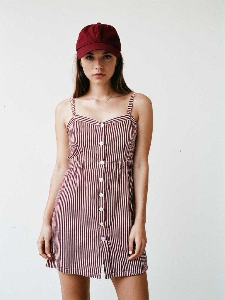 A woman is wearing a casual summer mini dress styled with thin straps and vertical red and white stripes. She pairs the outfit with a matching red cap, presenting a fresh and youthful summer look against a simple white background.