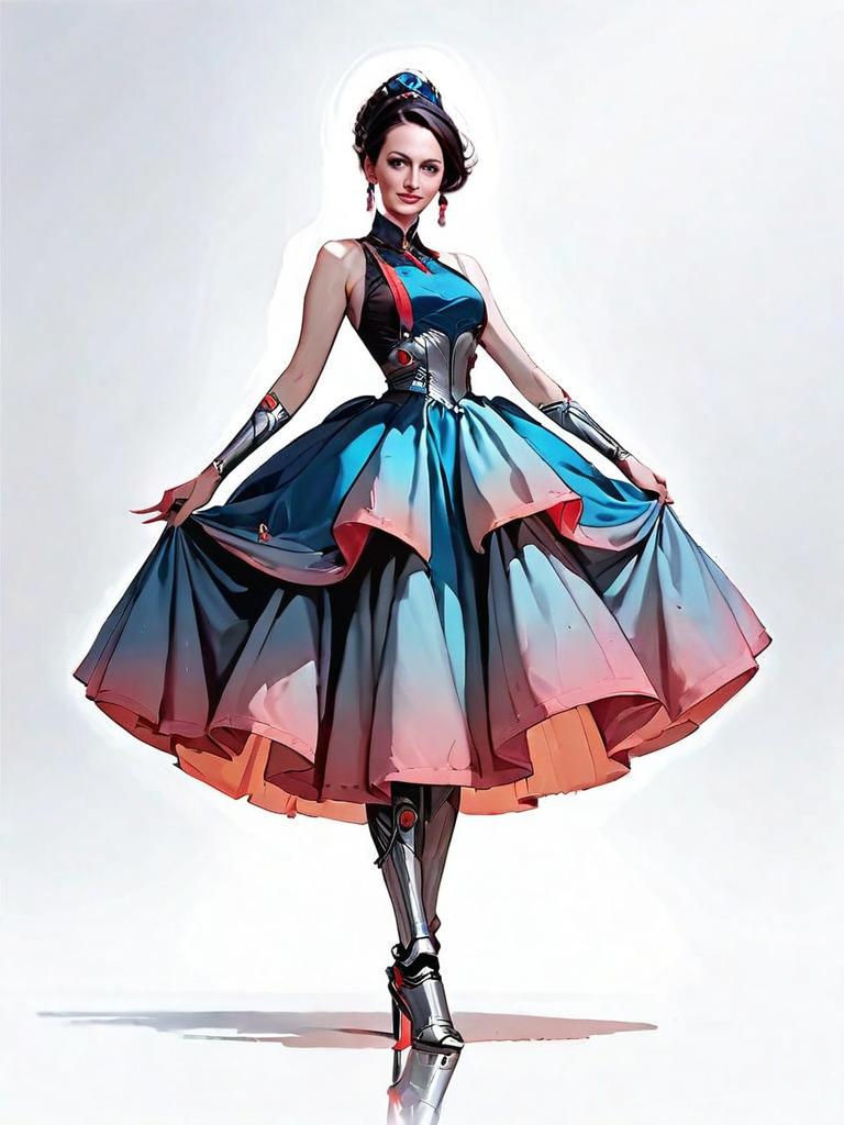 This striking digital illustration features a woman in a futuristic, elegant evening dress with a full skirt and metallic accents, blending classic fashion with sci-fi elements. The detailed rendering showcases a realistic face and full-body shot, capturing the essence of a refined yet modern aesthetic inspired by comic book art styles.