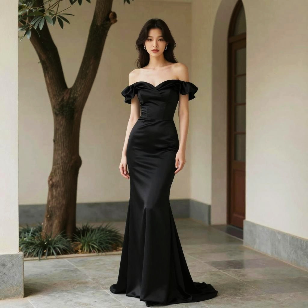 A woman stands gracefully in a hallway wearing an elegant black off-shoulder mermaid gown. The dress features a fitted silhouette with ruffled sleeves that add a touch of sophistication and classic style. The minimalist background with neutral tones highlights the sleek, formal design of the attire.