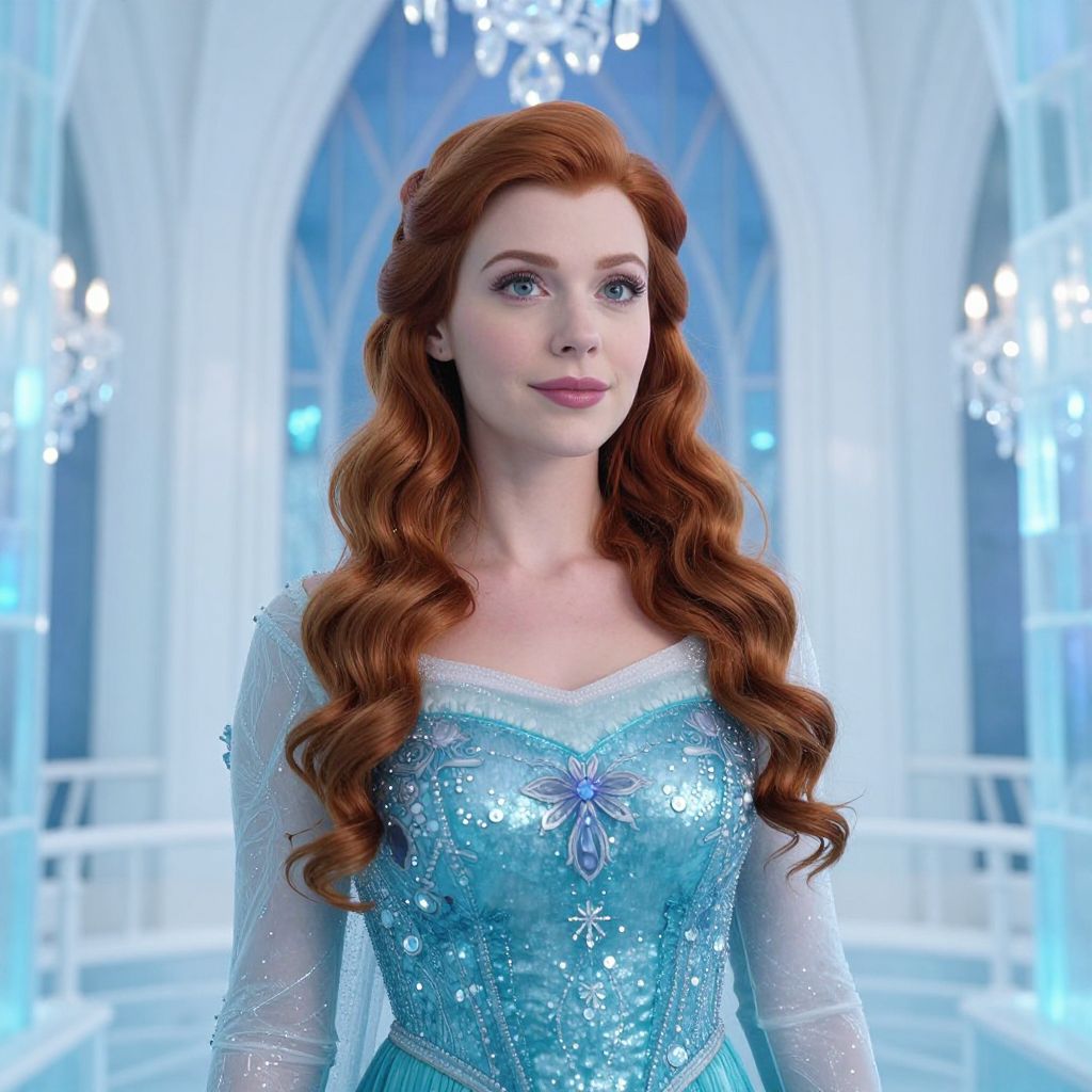 A beautiful red-haired woman dressed in an intricate, shimmering blue gown stands gracefully in an elegant, icy-themed palace. The detailed embellishments on her dress and the grand, bright surroundings evoke a fantasy or fairy tale ambiance.