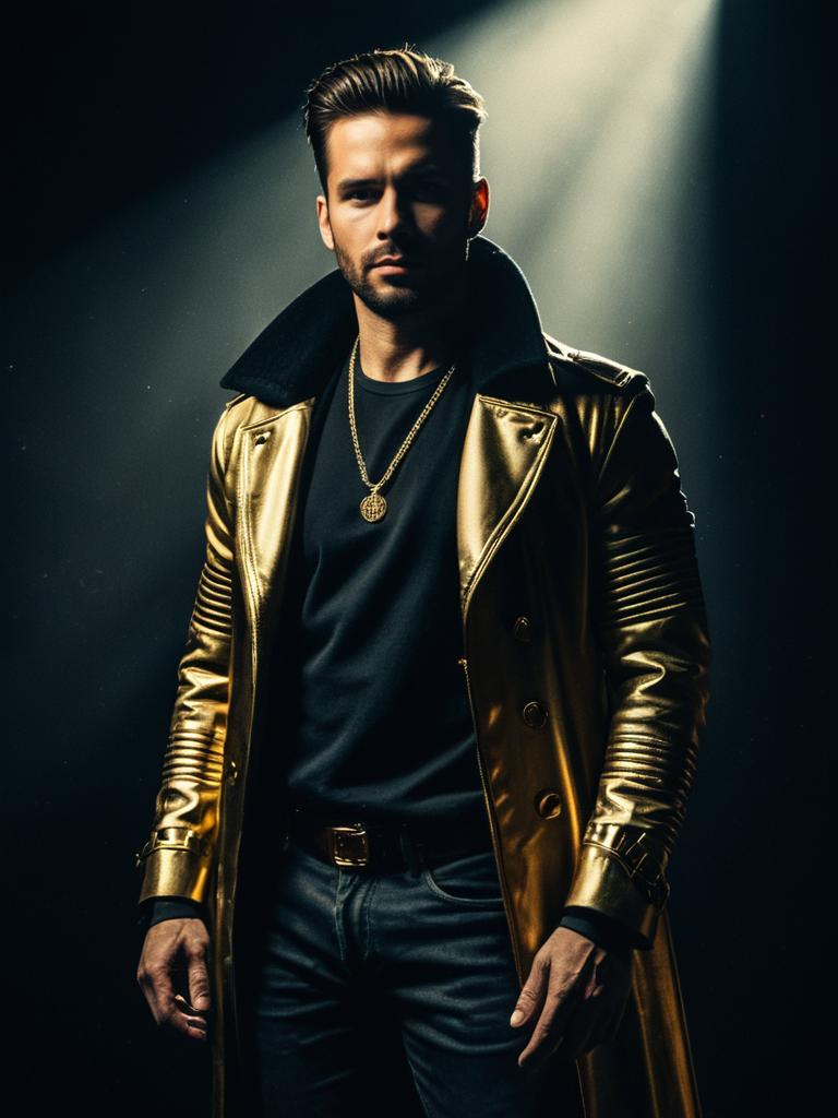 A man models a striking modern fashion outfit featuring a shiny gold trench coat with quilted sleeve details, paired with a black shirt and jeans. The photorealistic, detailed studio portrait highlights his confident pose under dramatic lighting, emphasizing a bold contemporary style.