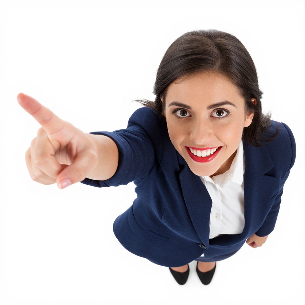 A confident young woman in a navy business suit smiles brightly while pointing directly at the camera, conveying determination and engagement. The high-angle perspective emphasizes her assertive and approachable demeanor against a clean white background.
