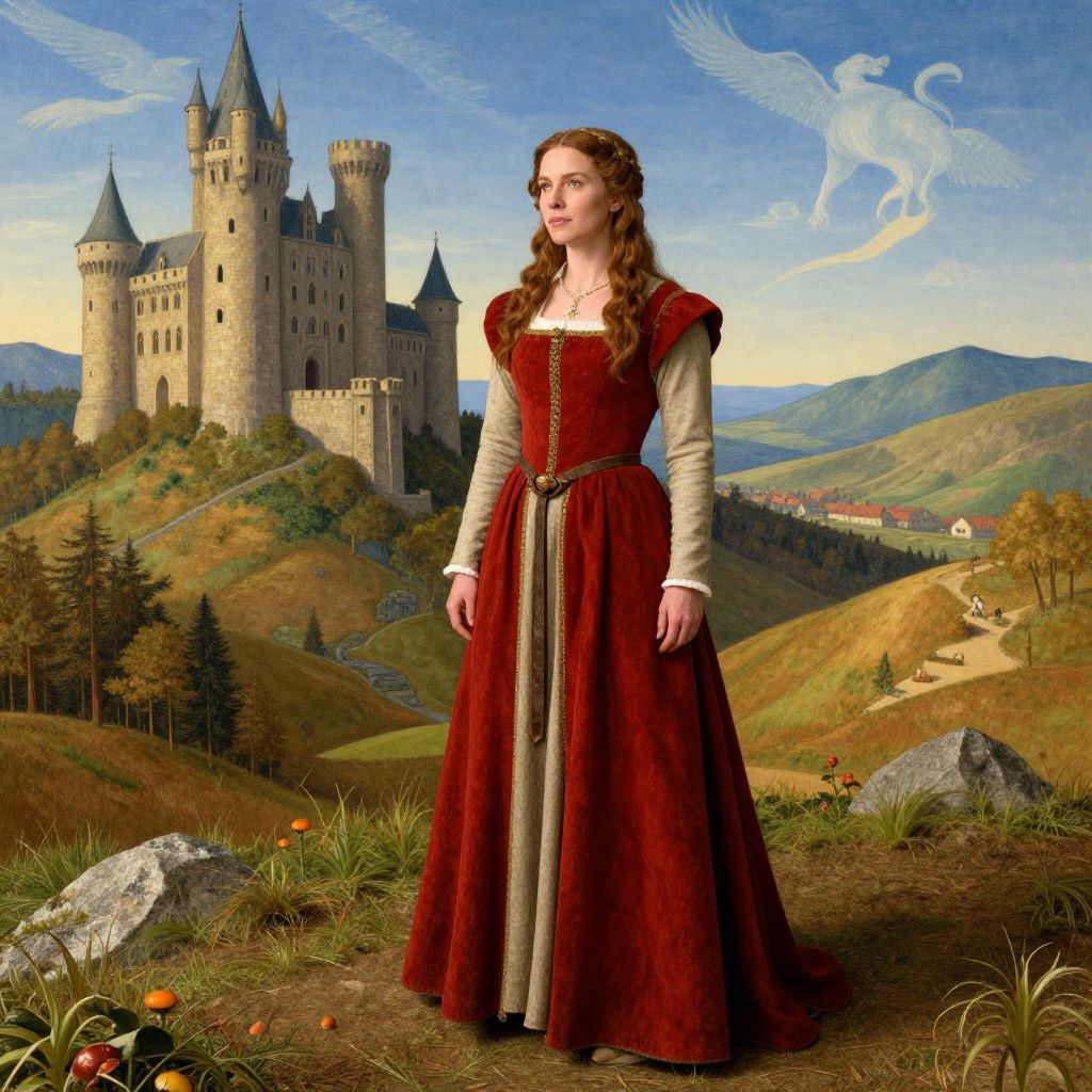 A woman dressed in a rich, medieval-style red gown stands gracefully in the foreground of a picturesque landscape featuring a grand stone castle atop a hill. The scene combines historical costume and fantasy elements, highlighted by the ethereal, dragon-like figure in the sky, evoking a Renaissance-inspired fantasy narrative.
