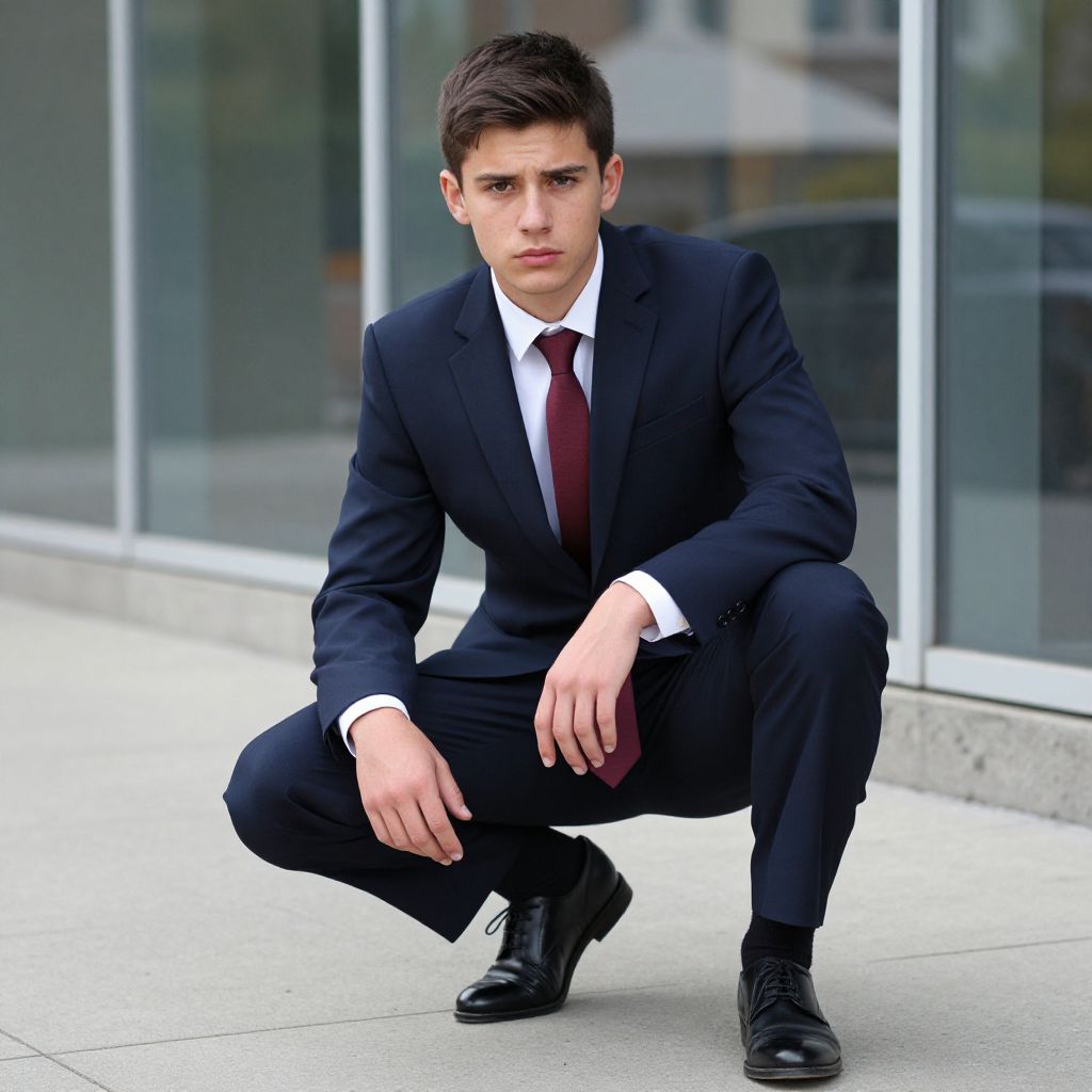 A young man in a sharp navy blue suit and burgundy tie poses confidently outdoors, crouching on a concrete surface in front of a modern glass building. His serious expression and formal attire highlight a professional and contemporary style.