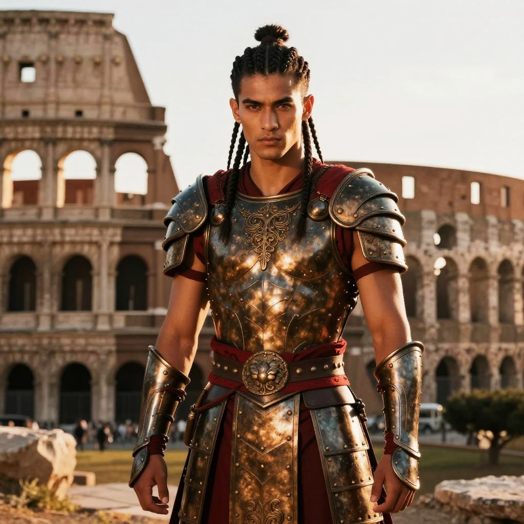 A young man dressed as a Roman gladiator stands confidently in front of the iconic Colosseum in Rome. His detailed leather and metal armor with ornate decorations and braided hair reflect a striking blend of historical influence and modern styling.