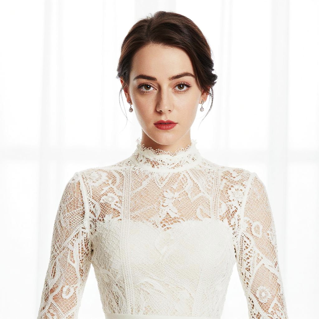 A young woman in a delicate white lace high-neck dress poses against a softly lit white background. Her hair is styled in an elegant updo, and she wears subtle pearl earrings that complement the sophisticated and refined look, embodying a modern yet classic bridal or formal fashion style.