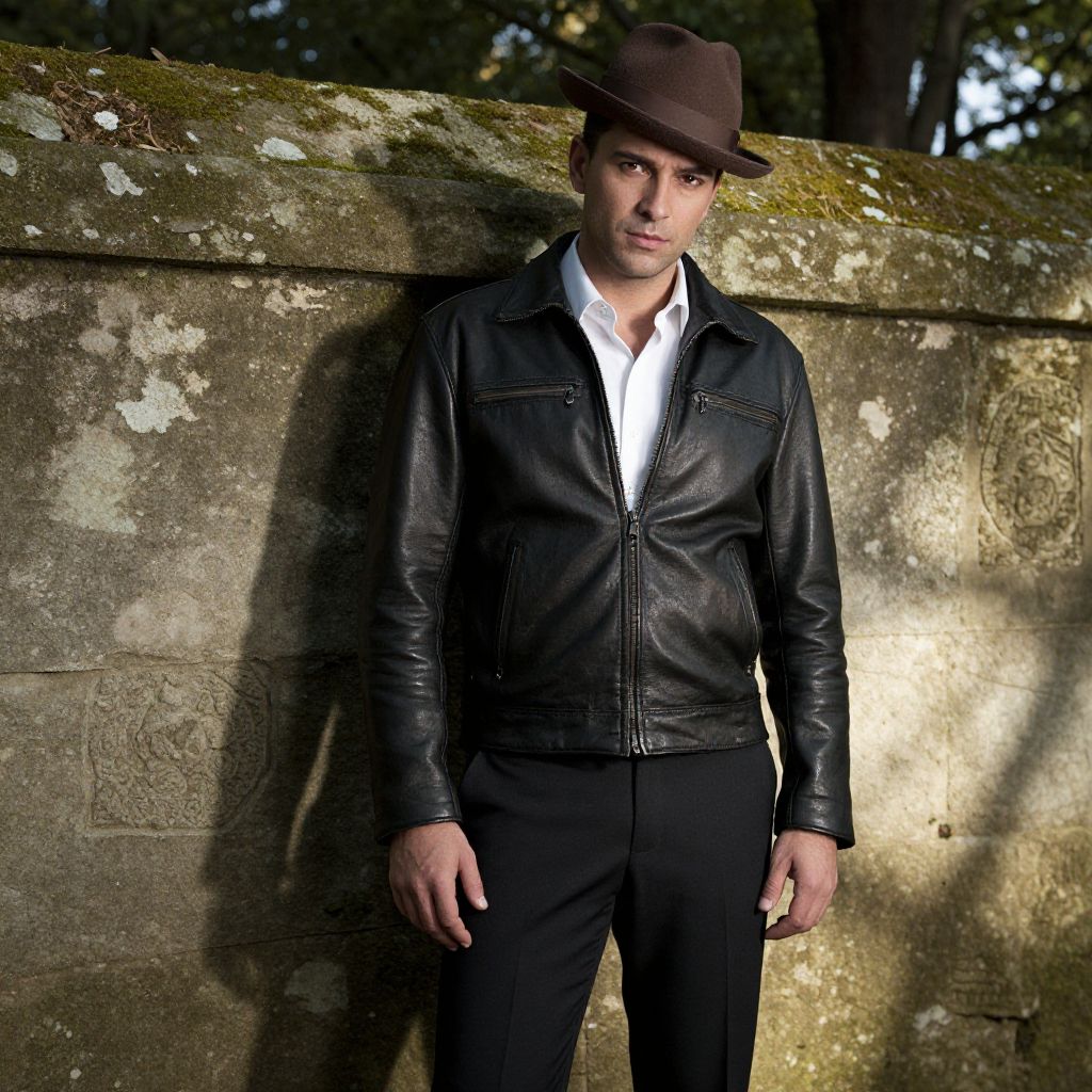 A man wearing a brown fedora hat and a black leather jacket stands confidently against a textured stone wall covered with moss. The scene evokes a vintage or classic noir aesthetic with natural outdoor lighting highlighting his composed expression.