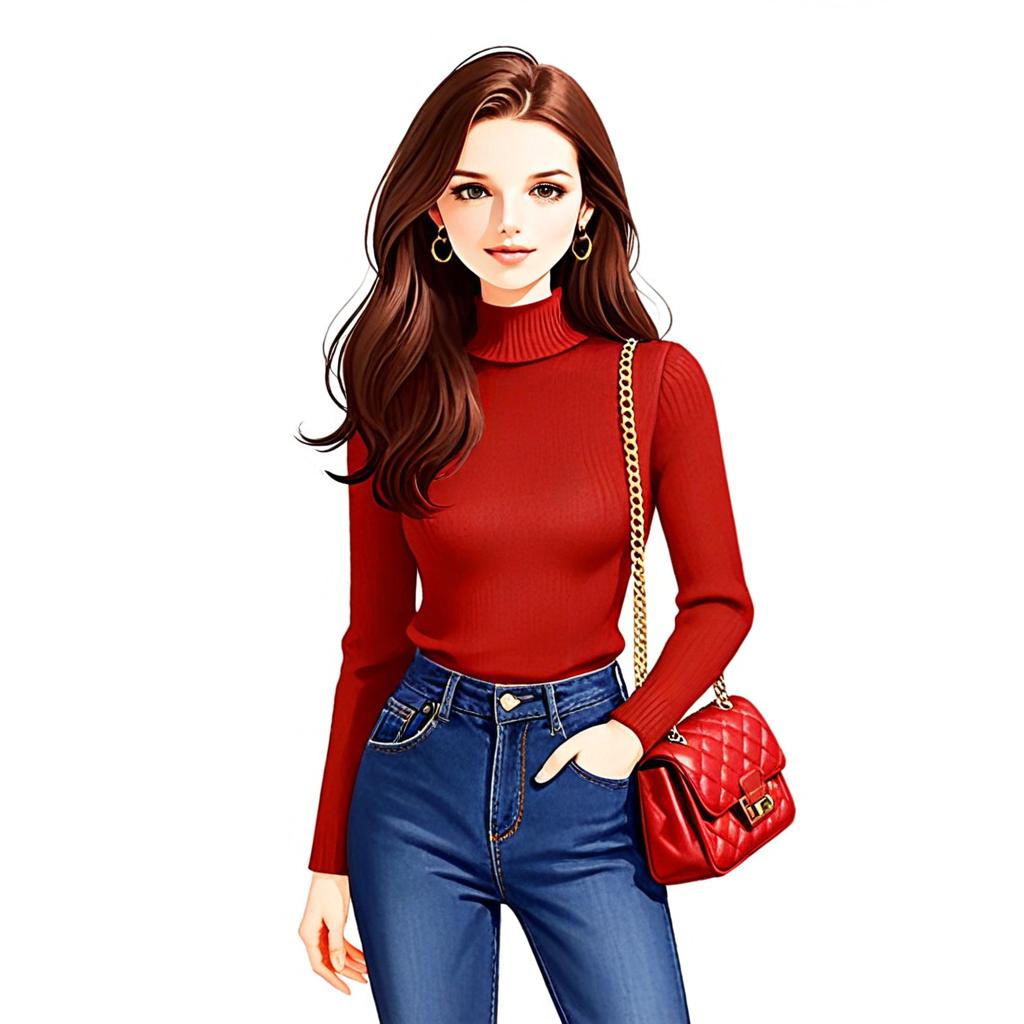 This digital illustration features a stylish woman with long brown hair wearing a fitted red turtleneck and high-waisted blue jeans. She accessorizes with gold hoop earrings and carries a chic red quilted handbag with a gold chain strap, embodying a casual yet elegant fashion style.