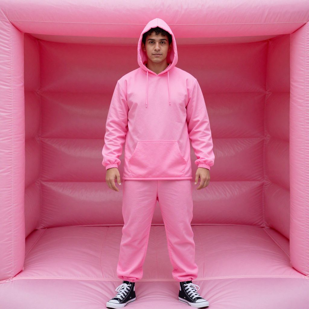 A young man stands confidently inside a pink padded room, dressed in a matching pink hoodie and sweatpants. The vibrant, monochromatic setting combined with casual streetwear creates a bold and modern visual statement.