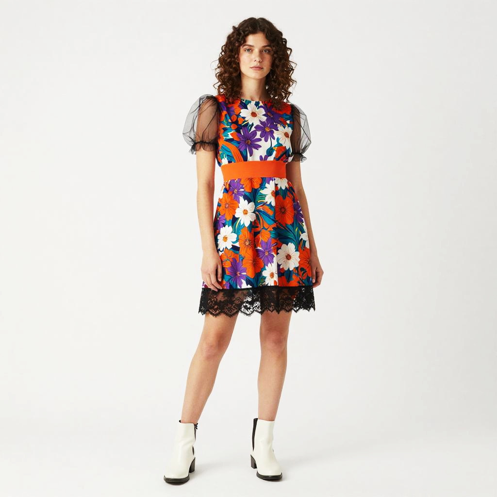 A young woman stands confidently wearing a vibrant, floral-patterned dress featuring bold orange, purple, and white flowers with a solid orange waistband and delicate black lace trim. The dress combines playful puffed sheer sleeves with a modern silhouette, paired with stylish white ankle boots, exemplifying contemporary Gen Z fashion trends.