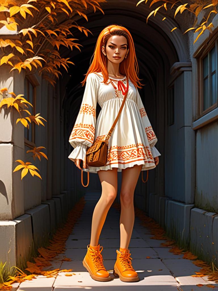 Bohemian Woman in White Dress with Orange Feather Pattern and Autumn Boots