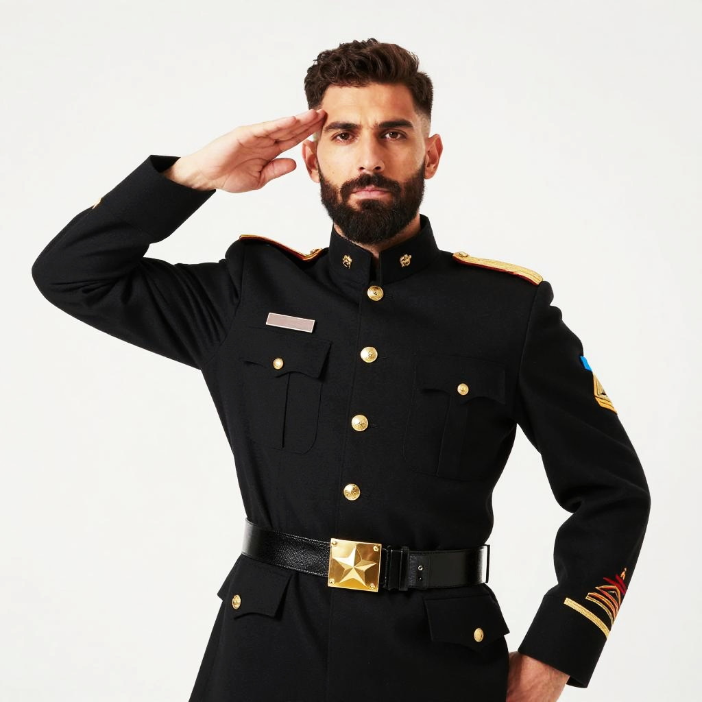 A man dressed in a formal black military uniform performs a respectful salute, embodying discipline and honor. The uniform features gold buttons, a prominent gold star belt buckle, and detailed insignia on the sleeves and collar, highlighting a ceremonial or official military style.