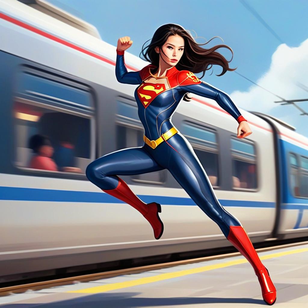 A dynamic digital artwork features a woman dressed as Supergirl in a sleek, modern costume as she leaps powerfully in front of a speeding train. The vibrant colors and motion blur highlight the superhero's speed and strength in this energetic scene inspired by comic book style.