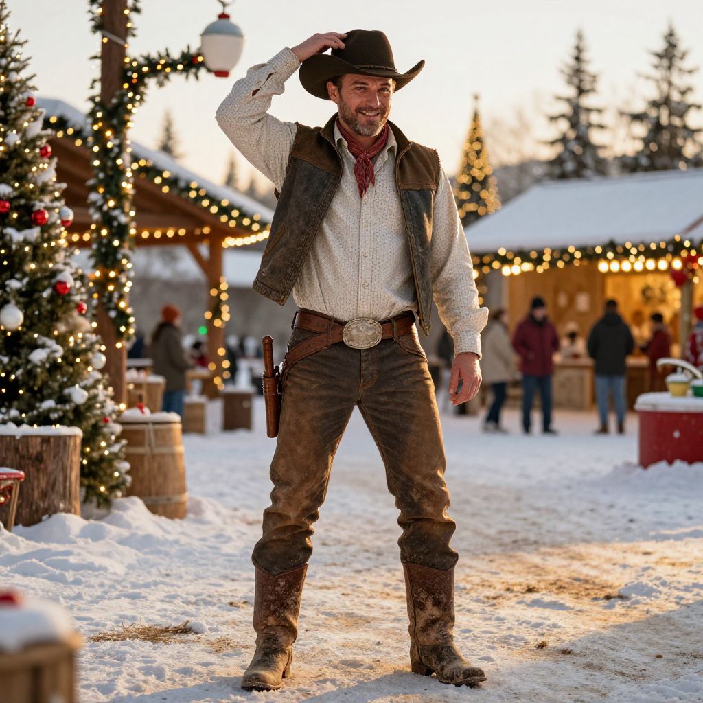 A smiling man dressed in classic cowboy attire, including a brown hat, leather vest, and boots, stands outdoors in a festive winter setting. Christmas decorations and market stalls adorned with lights create a warm holiday atmosphere despite the snowy ground. The scene captures a blend of rustic western style and seasonal celebration.