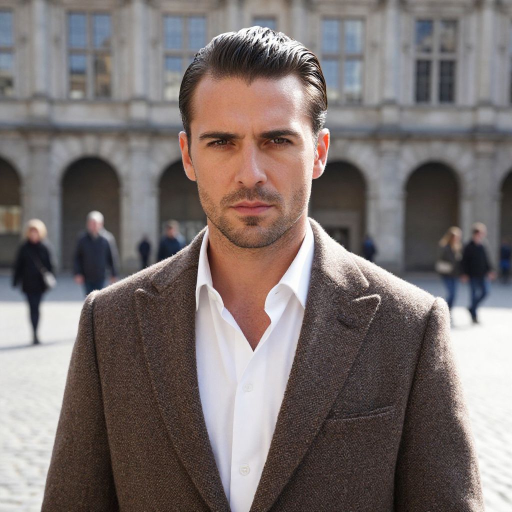 A confident man with slicked-back hair wearing a brown tweed blazer and white shirt stands in an outdoor urban setting with a historic building in the background. The portrait captures a sharp, stylish look with a serious expression, emphasizing modern men's fashion in a classic European city atmosphere.