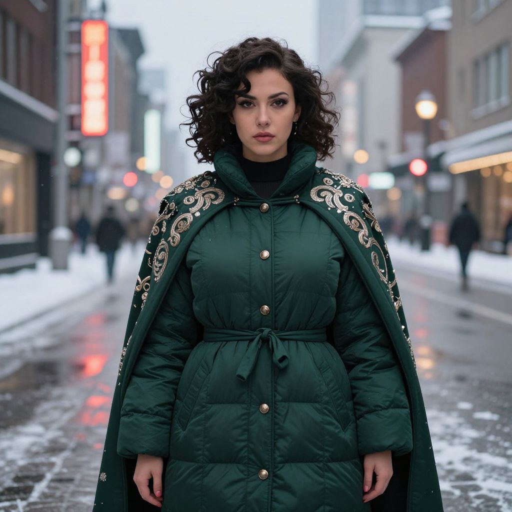 A confident woman stands in the middle of a snowy city street wearing a stylish dark green quilted winter coat with gold button details and an embroidered cape draped over her shoulders. The urban backdrop is softly blurred, highlighting her poised expression and curly hair against the cold, wintry environment.