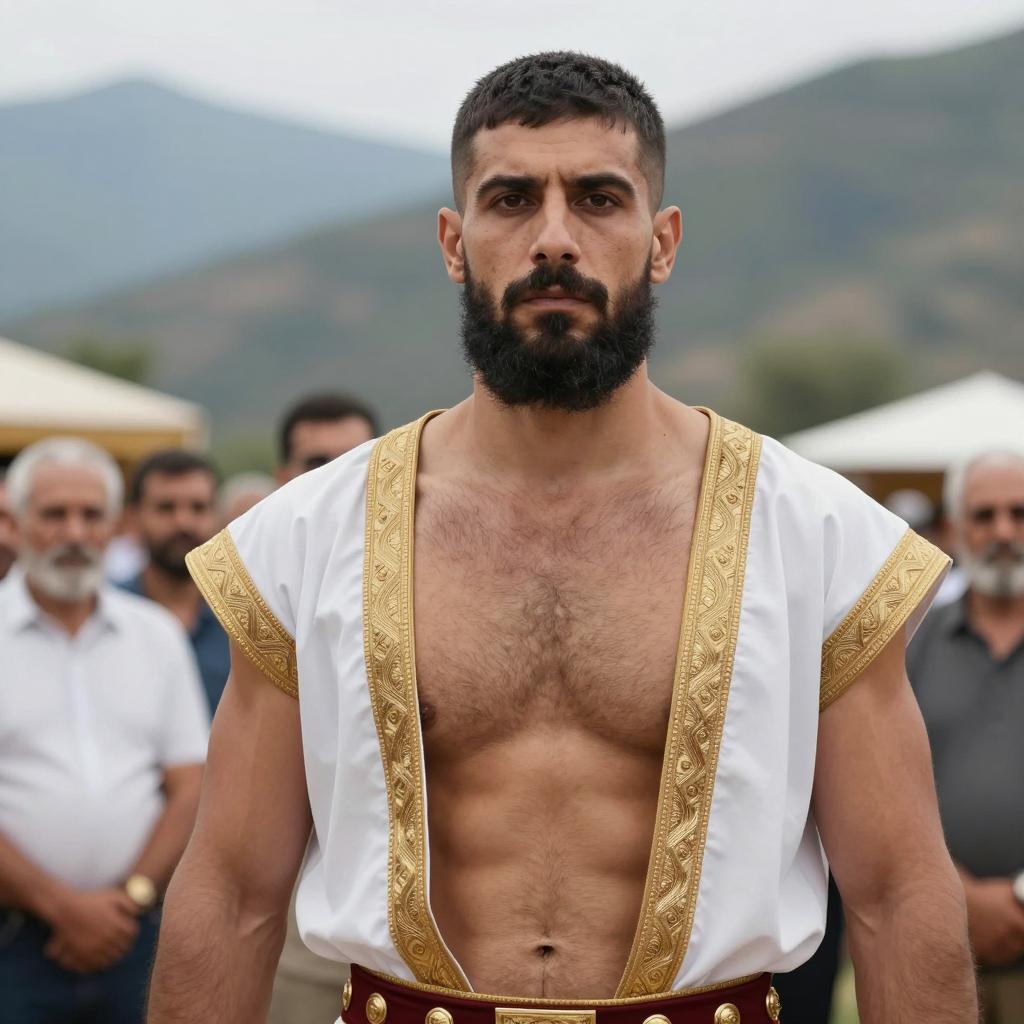 A muscular man with a thick beard stands confidently in traditional attire featuring a white garment with ornate gold trim. The outdoor setting includes a blurred crowd and mountainous background, highlighting a cultural or ceremonial event.
