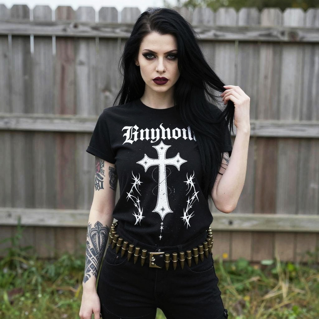 A woman with striking black hair and dark makeup poses outdoors against a wooden fence, embodying a gothic or metal style. She wears a black t-shirt with a prominent white cross graphic and text, paired with black pants and a belt adorned with bullet casings, complemented by visible tattoos on her arms.