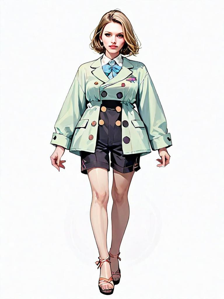 This digital artwork features a stylish woman in a realistic comic style, showcasing a contemporary fashion outfit with a light-colored double-breasted jacket and black shorts adorned with colorful buttons. The full-body shot highlights the character's confident pose and modern aesthetic, blending detailed facial features with elegant, clean lines.